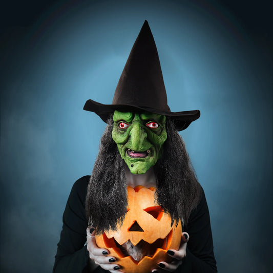 Látex assustadoras Bruxa Face Shield com cabelo preto e chapéu cabeça Halloween