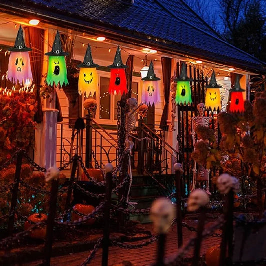 10 Peças de decoração suspensa de Halloween, chapéus de bruxa fantasma iluminados