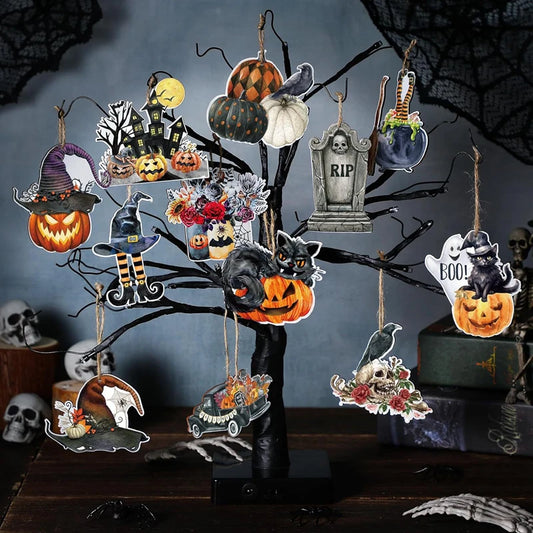 36 Peças de enfeites de madeira de Halloween vintage decorações de Halloween árvore