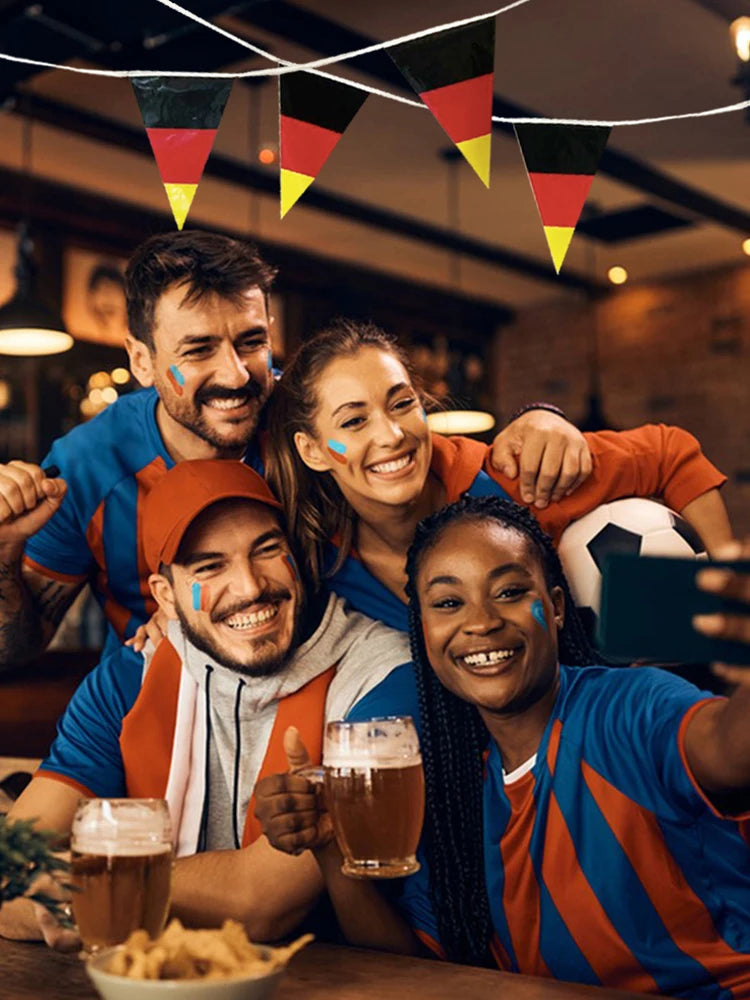 5. Resistente às intempéries: Projetadas para suportar diversos desafios climáticos, nossas bandeiras de futebol alemãs são feitas com material PE que apresenta excelente resistência às intempéries, garantindo que permaneçam vibrantes e sem danos ao sol, chuva ou neve.