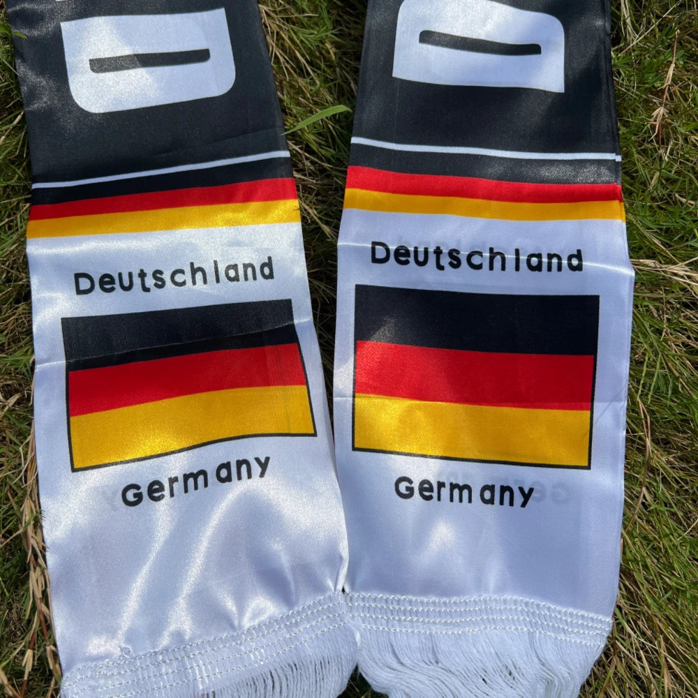 Materiais de alta qualidade: Os lenços com a bandeira alemã são feitos de cetim de poliéster com textura macia, cores vibrantes que não desbotam facilmente, estampas requintadas em alta definição com costura impecável, proteção solar e são laváveis, o que os torna duráveis para uso prolongado.