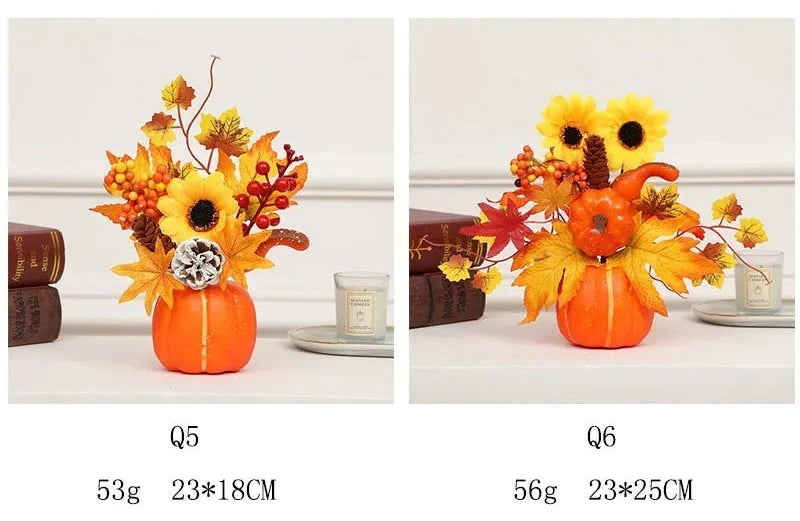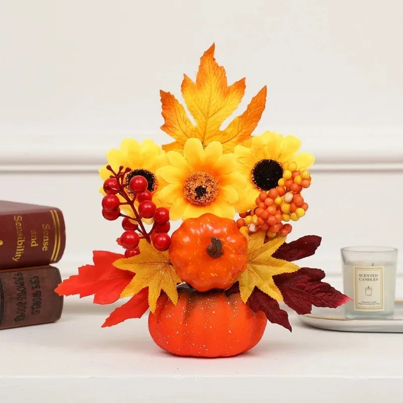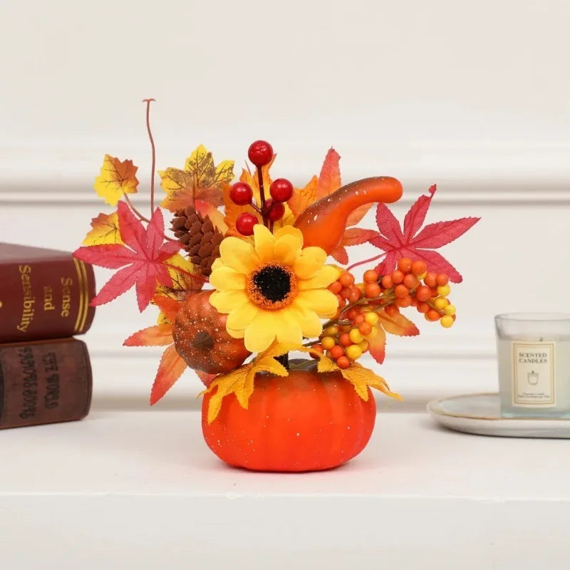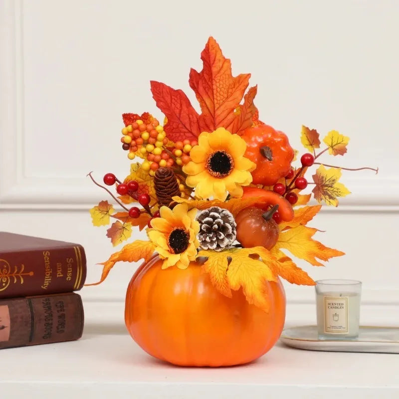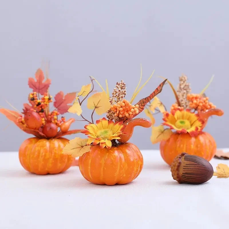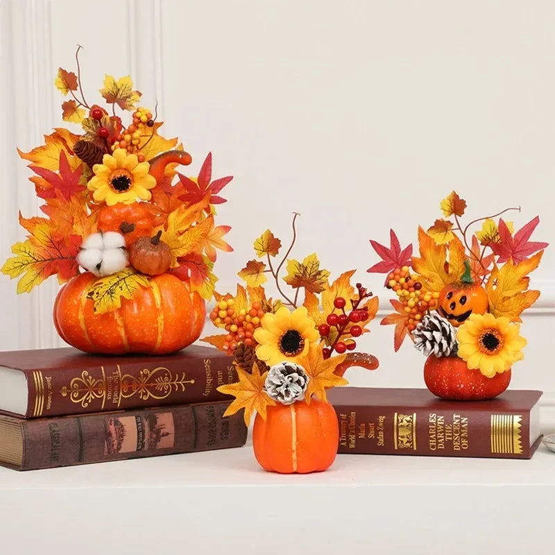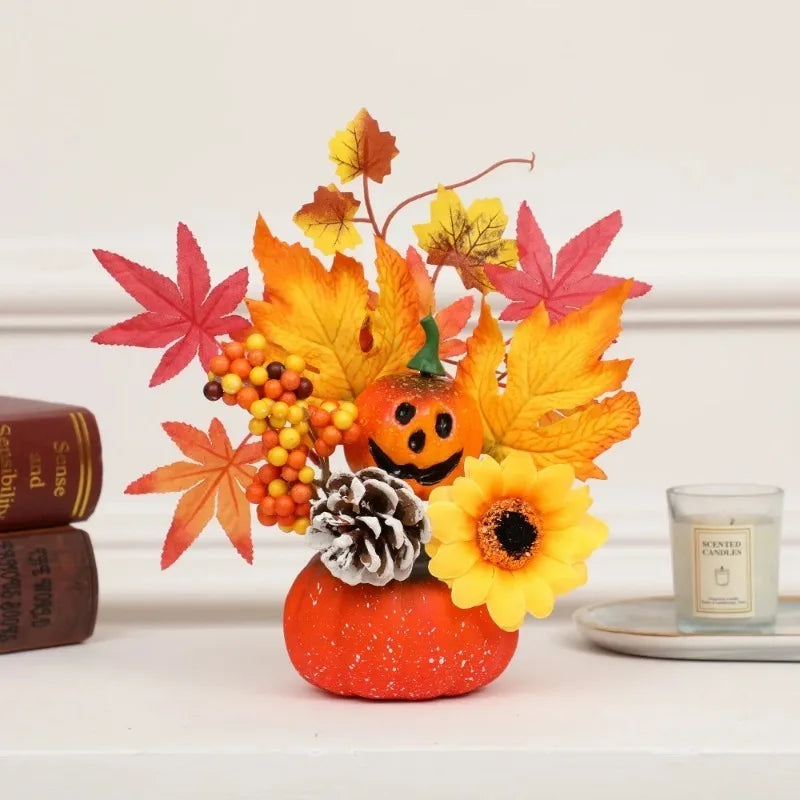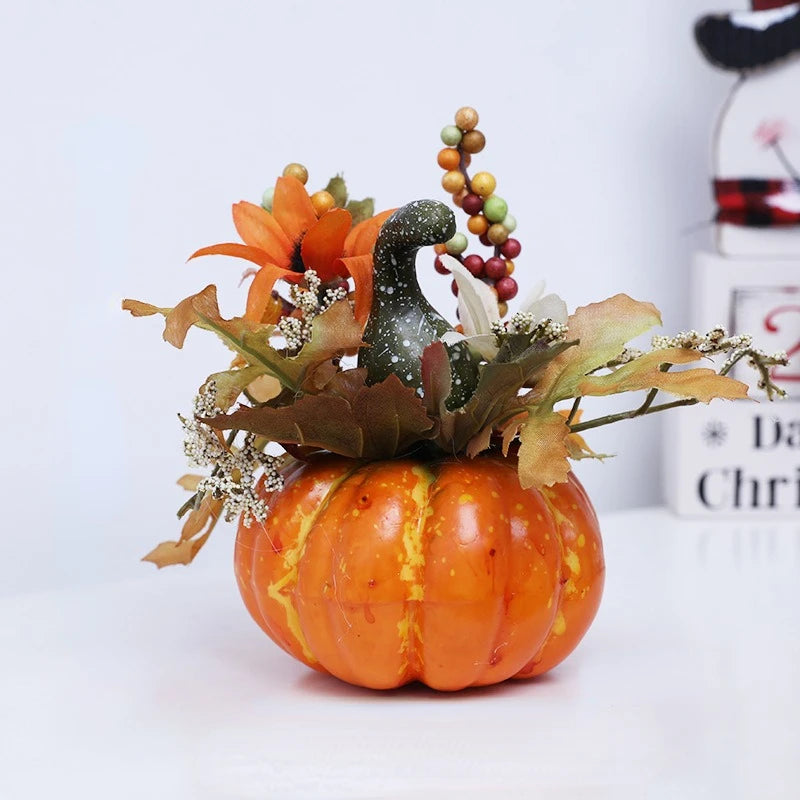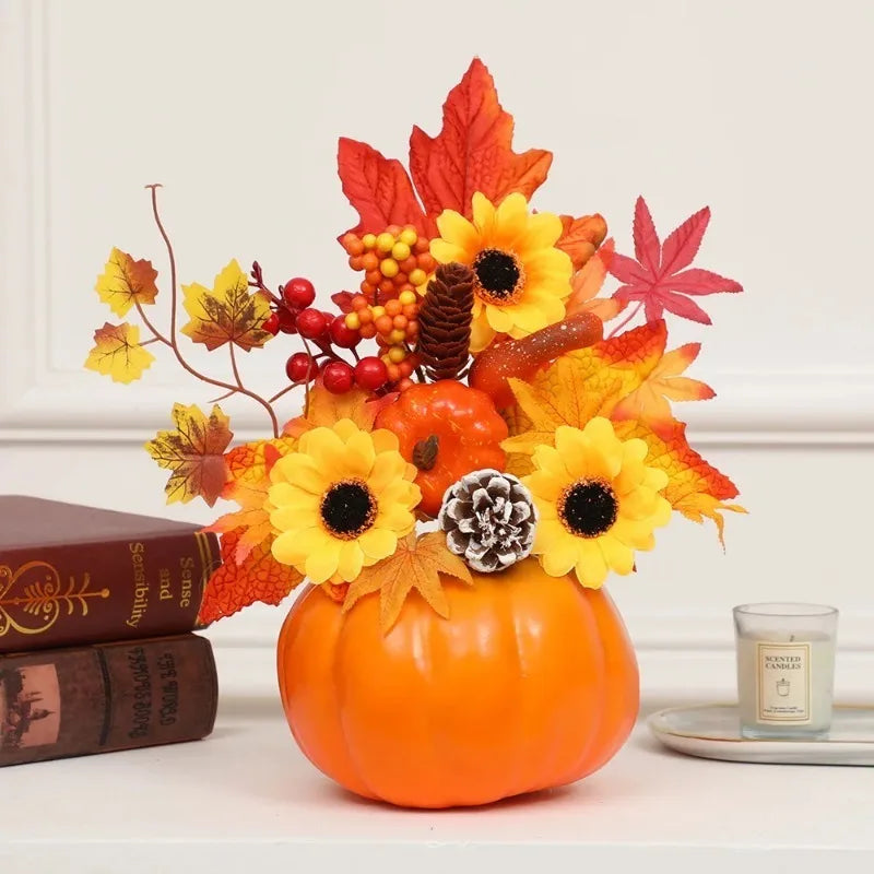 Festa Junina Abóbora artificial com flores, decoração de ação de graças com folhas bordo