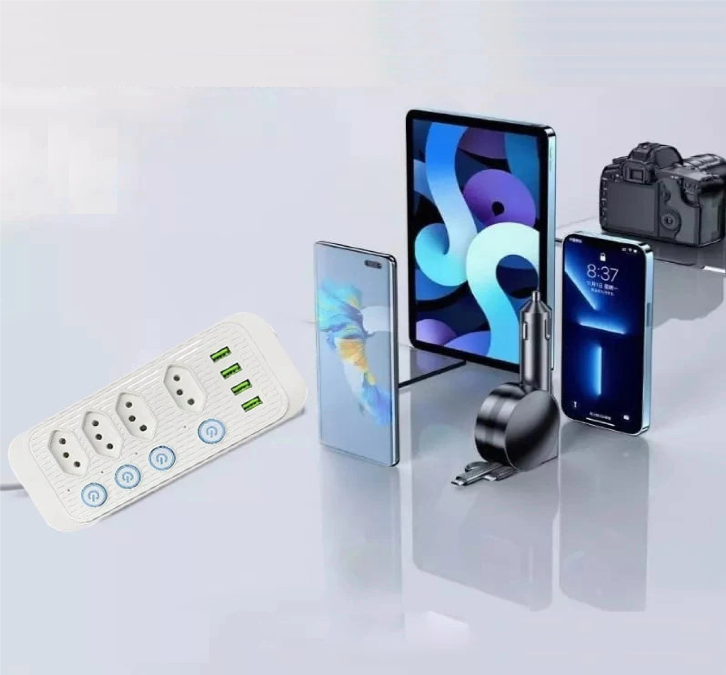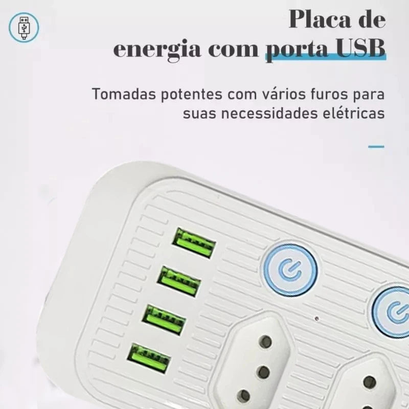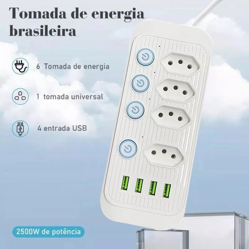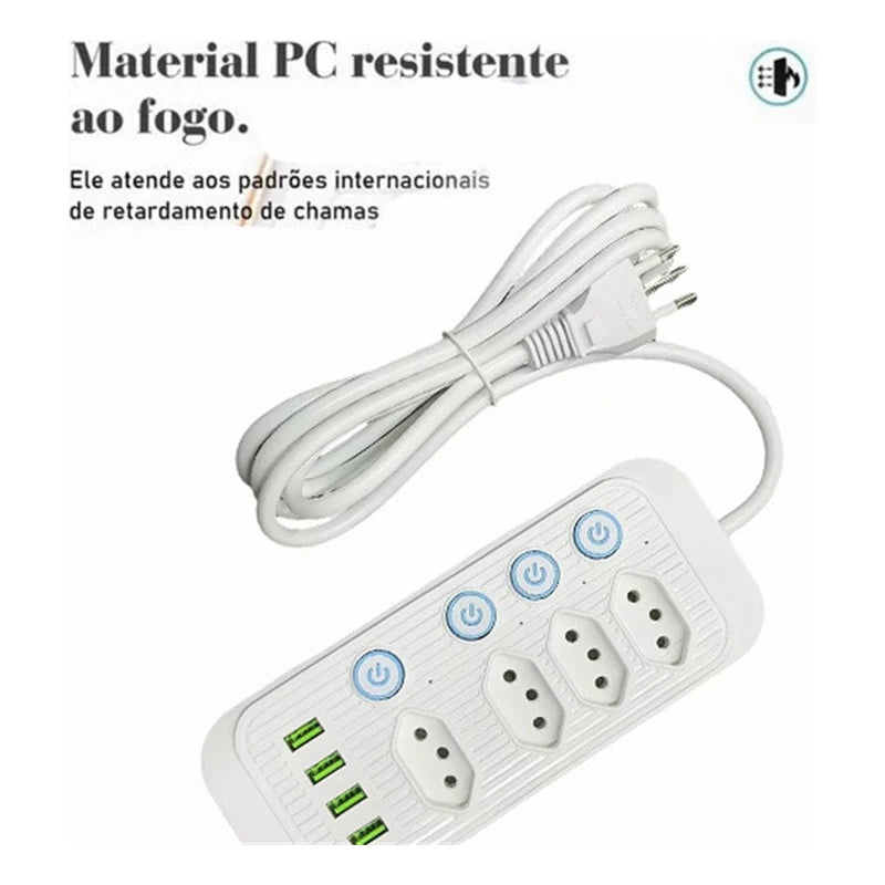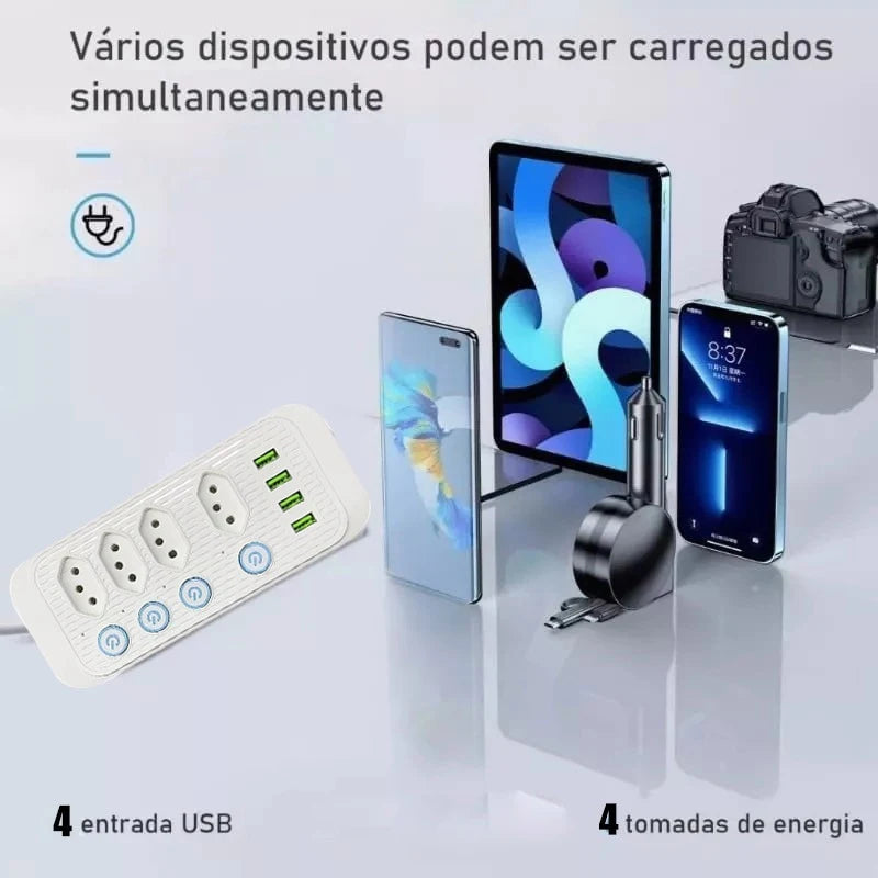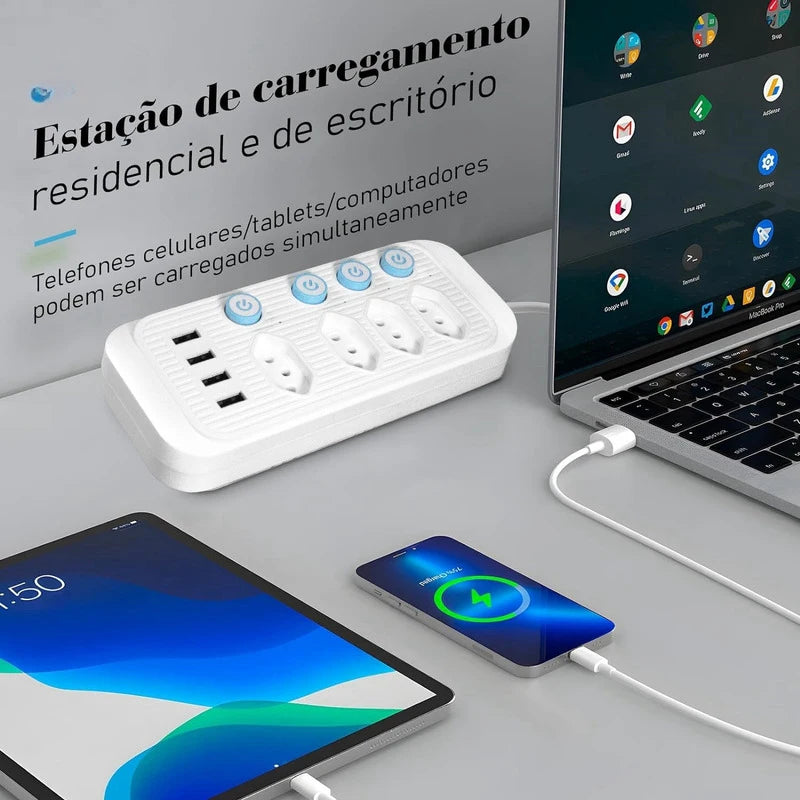 Design multifuncional: Nosso filtro de linha possui 4 tomadas de energia, 4 portas USB e 1 tomada universal, permitindo que você alimente até 8 dispositivos simultaneamente, como smartphones, tablets e computadores. Atende às suas diversas necessidades de energia de forma conveniente e rápida