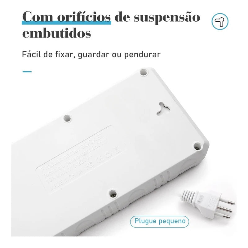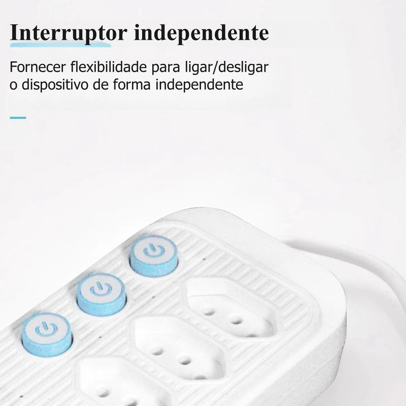 Design humanizado: O cabo de alimentação possui design 33% mais espesso, com material interno de cobre niquelado altamente condutivo, oferecendo menor resistência e melhor condutividade elétrica, com comprimento aproximado de 2 metros, ampliando o alcance de uso. O espaçamento entre soquetes é amplo, adequado para vários tipos de plugues, facilitando a inserção e remoção