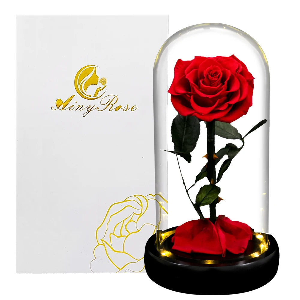 Flor de rosa eterna preservada verdadeira flor rosa em redoma de vidro presentes