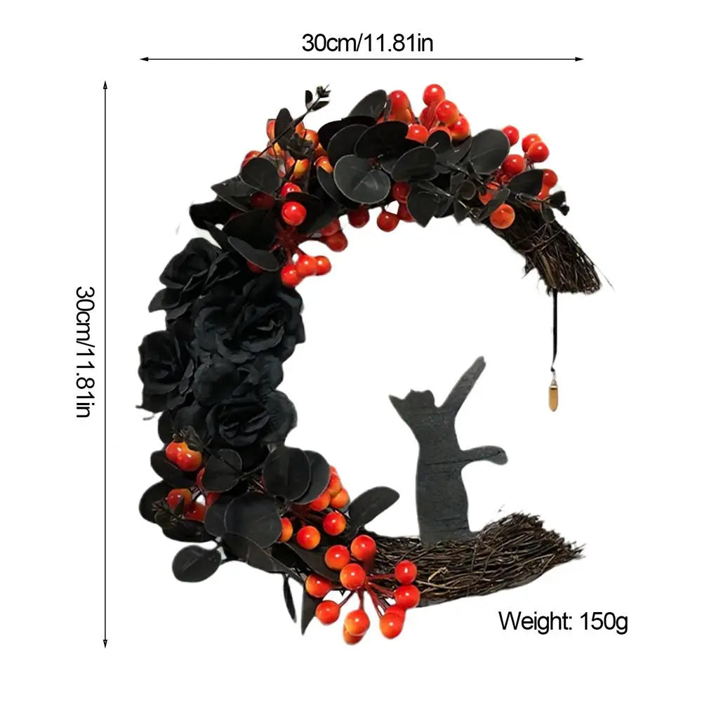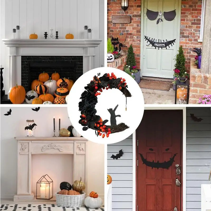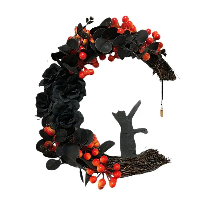 Melhore sua porta da frente com nossa guirlanda de gato da lua! Decorada com gatos, luas e frutas vermelhas, é adequada para uso em todas as estações. Duradoura e perfeita para qualquer festa ou ocasião festiva, nossa guirlanda certamente impressionará seus convidados com seu charme único.