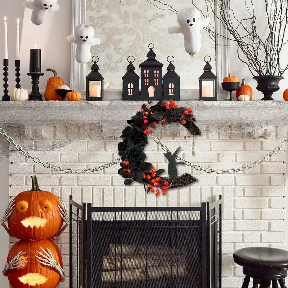 Guirlanda de gato de lua de Halloween Guirlanda de porta de gato de Halloween Decorações de terror Guirlanda de lua de Halloween com gato preto para festa.