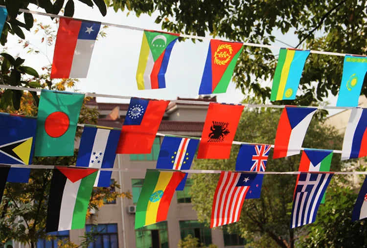 Excelente varal com 100 bandeirolas de diferentes países, pronta para o uso, só pendurar onde quiser.