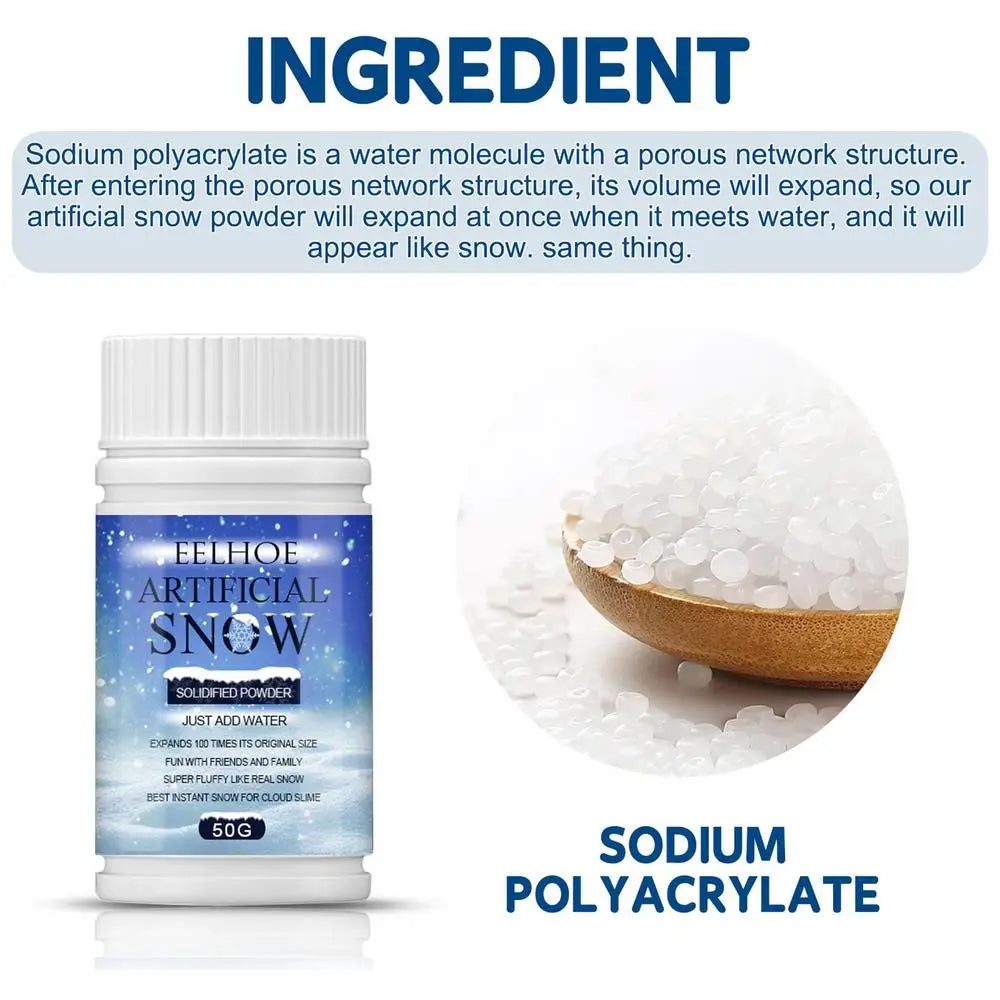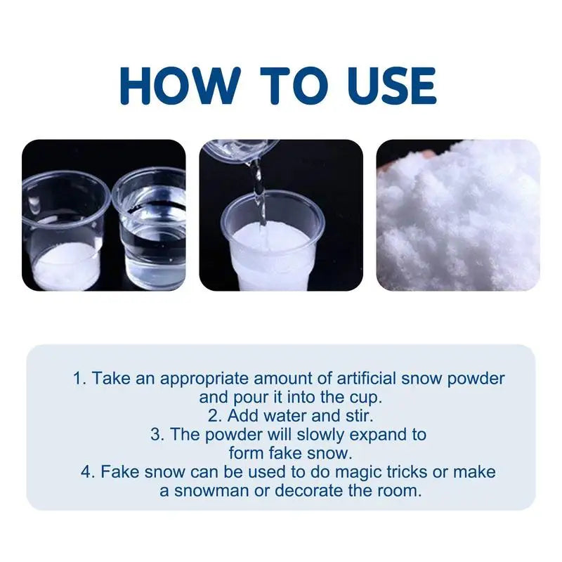 Divirta-se criando sua própria neve com este incrível pó de neve artificial. Basta adicionar água ao pó e ele se transformará em uma substância macia e fofa semelhante à neve. Você pode modificar a textura e a umidade da neve alterando a quantidade e a proporção de água.