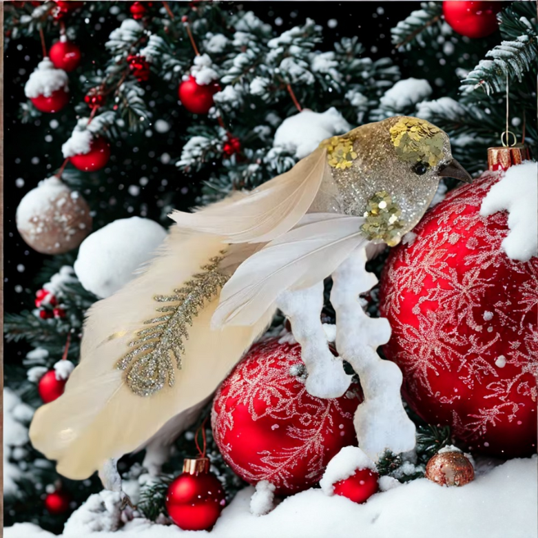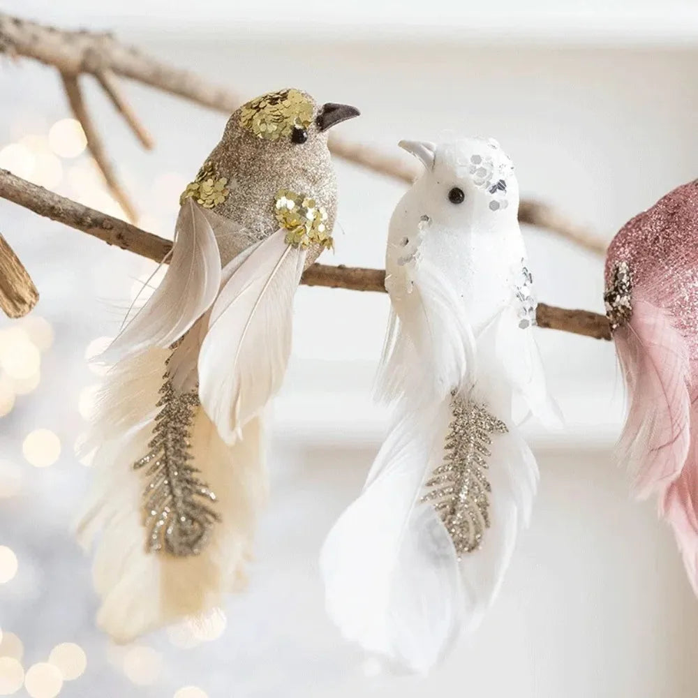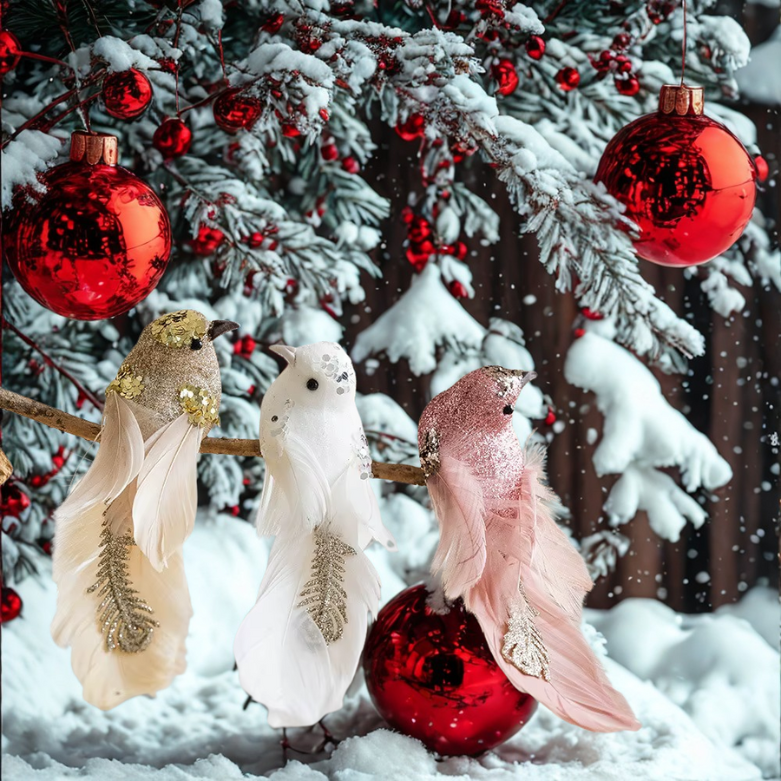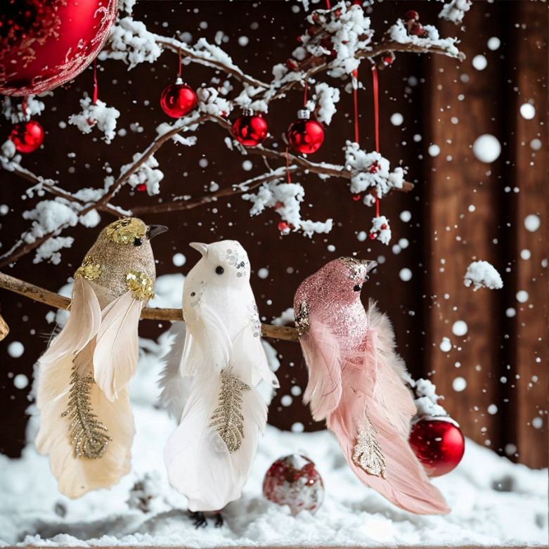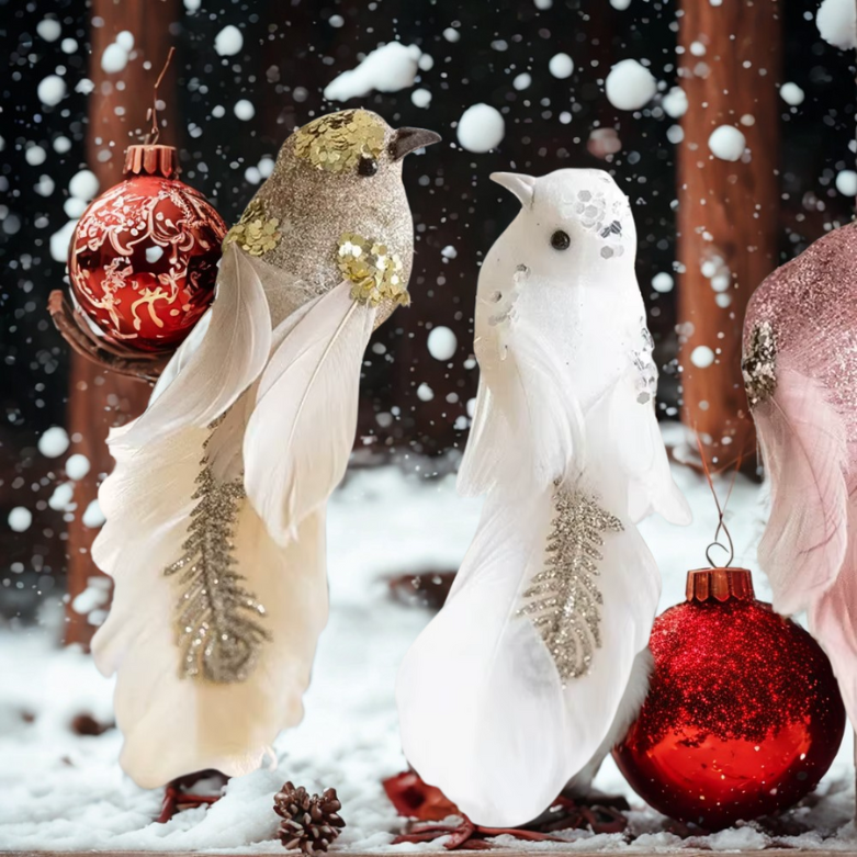 Transforme seu ambiente natalino em uma cena de inverno encantadora com estes pássaros com penas que adicionam um toque de charme à sua celebração de Natal.