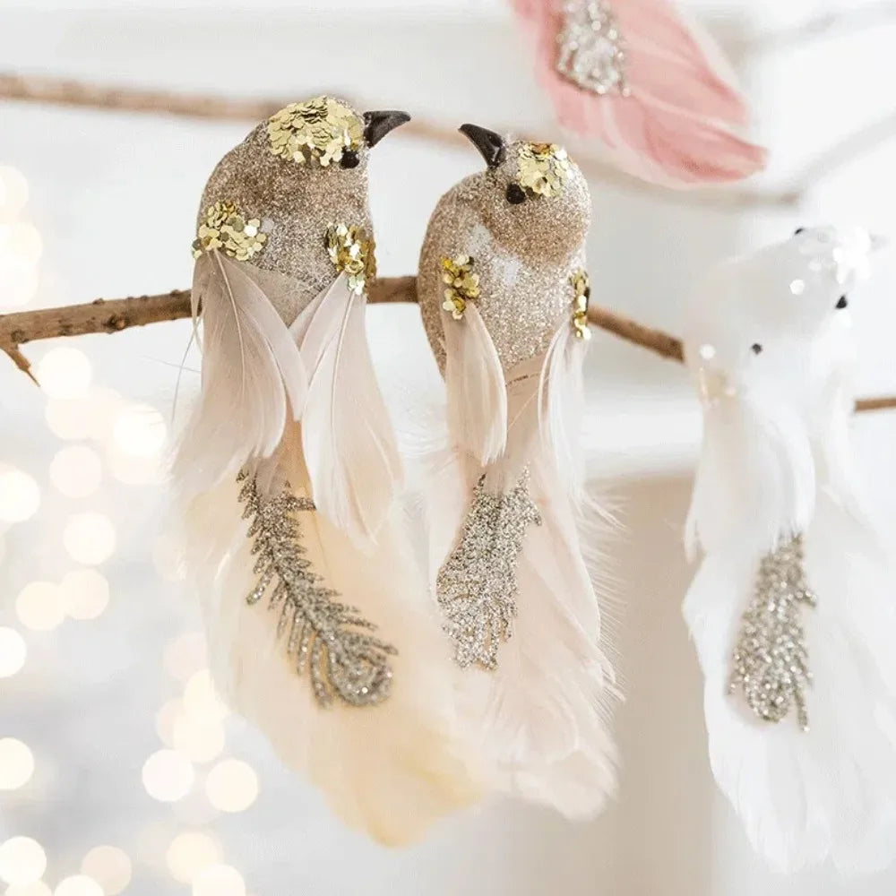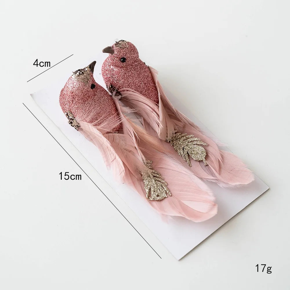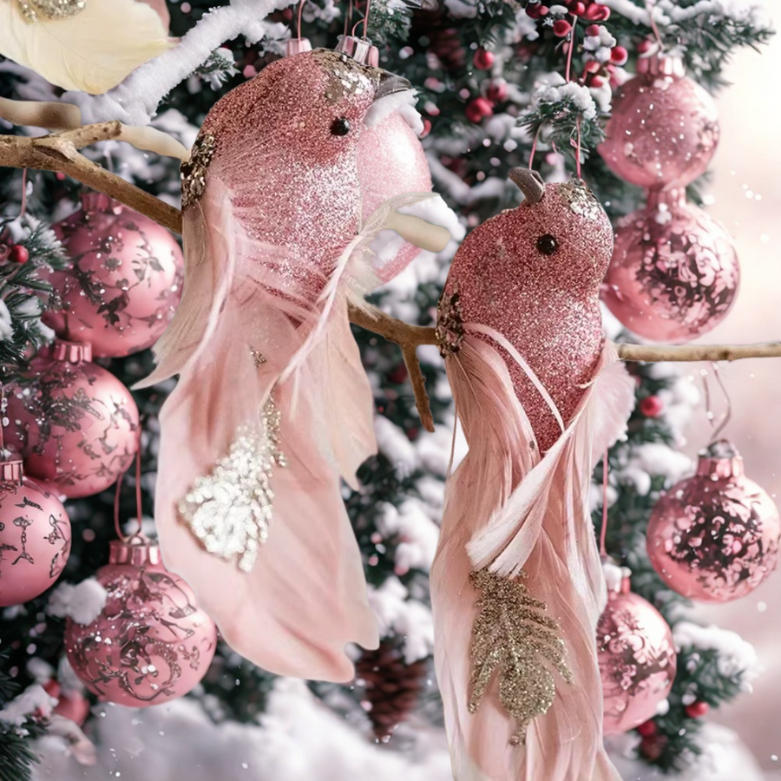 Eleve a decoração da sua festa com este delicado par de enfeites de pássaros com penas, essenciais para uma árvore de Natal visualmente deslumbrante.