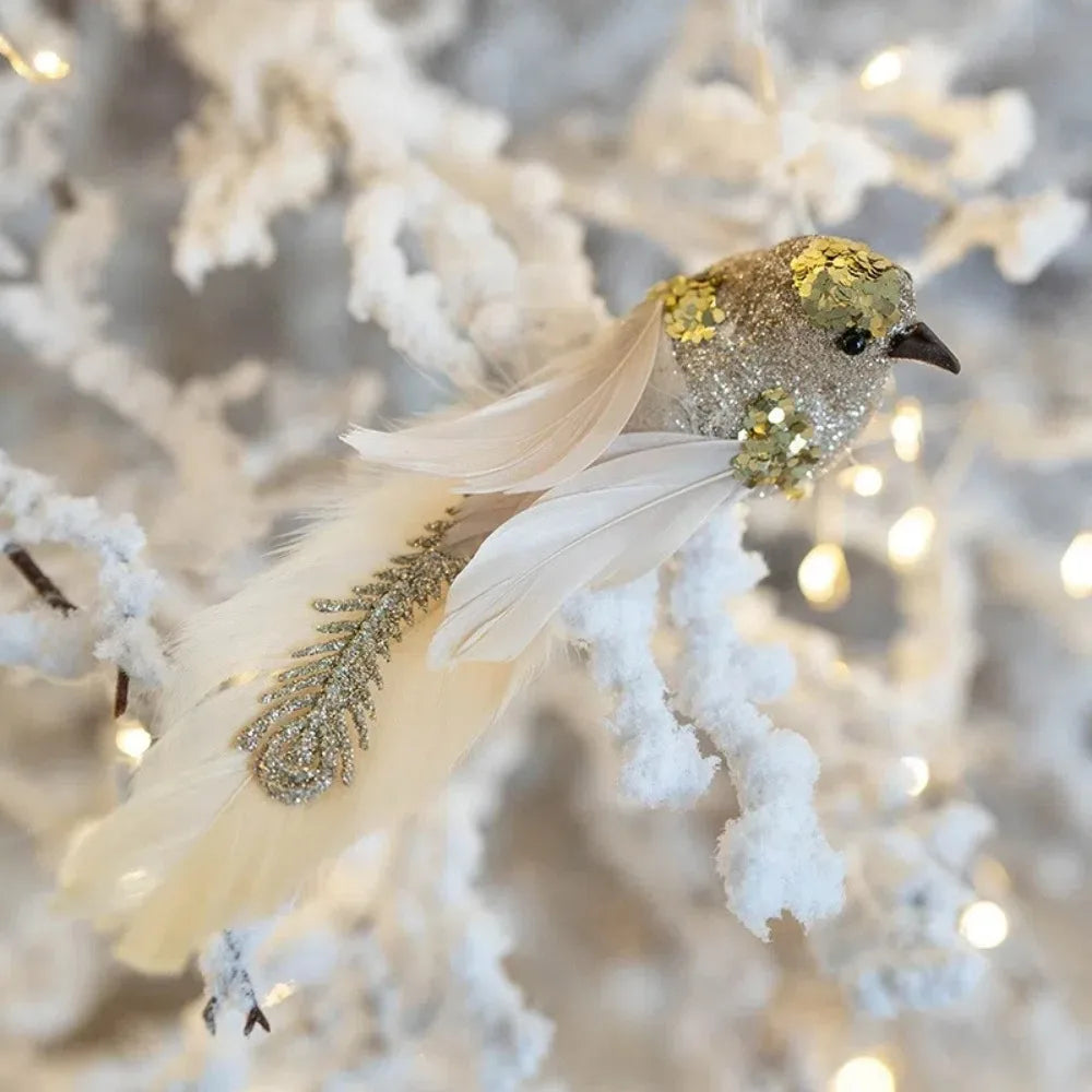 Dê um toque de elegância à sua decoração natalina com este delicado par de enfeites de pássaros emplumados, essenciais para uma árvore de Natal visualmente deslumbrante.