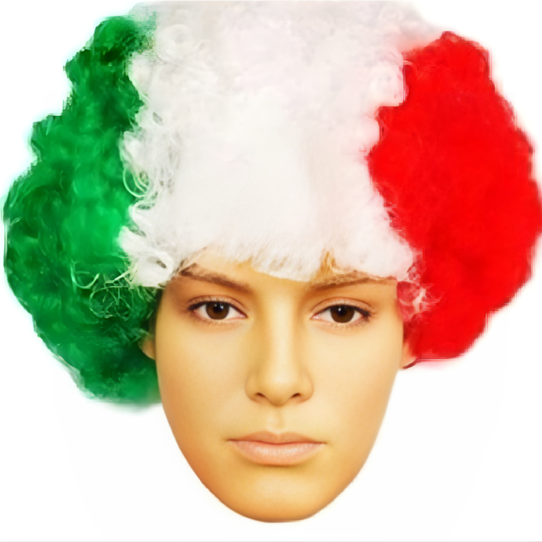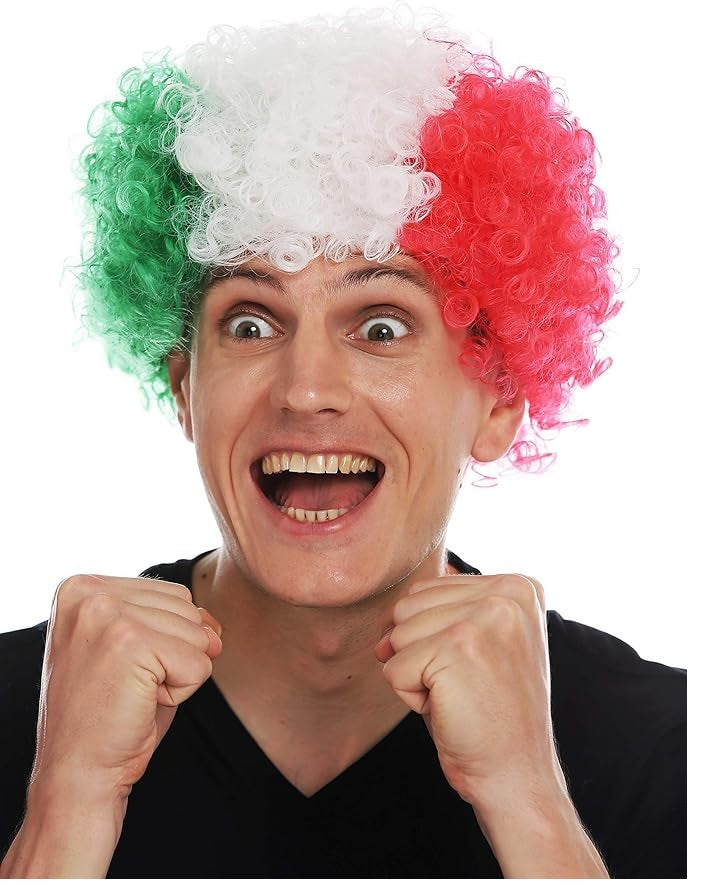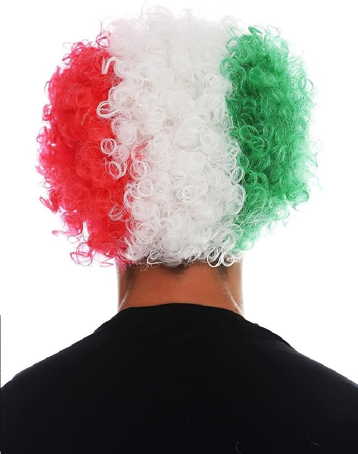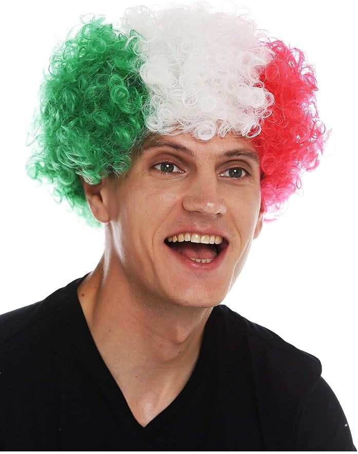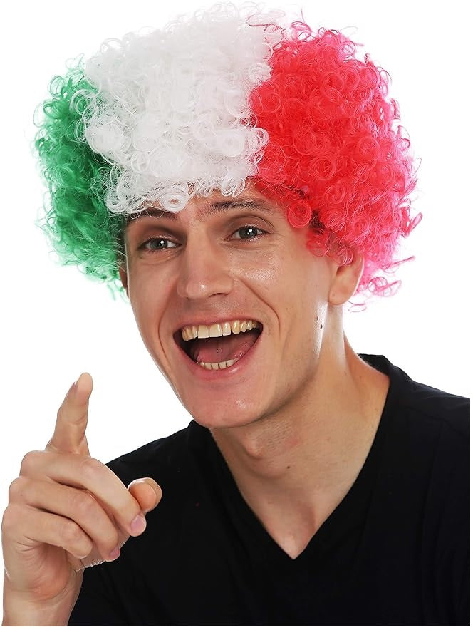 Peruca afro bem densa, crespa e encaracolada em verde, branco e vermelho. Lembra uma torcedora italiana de futebol. Mas pode ficar confuso se a Itália jogar contra o México. Húngaras podem simplesmente usar a peruca ao contrário - não tem problema, você pode usar essa peruca dos dois jeitos facilmente. Temas: peruca de torcedora, peruca afro, discoteca, cantora.